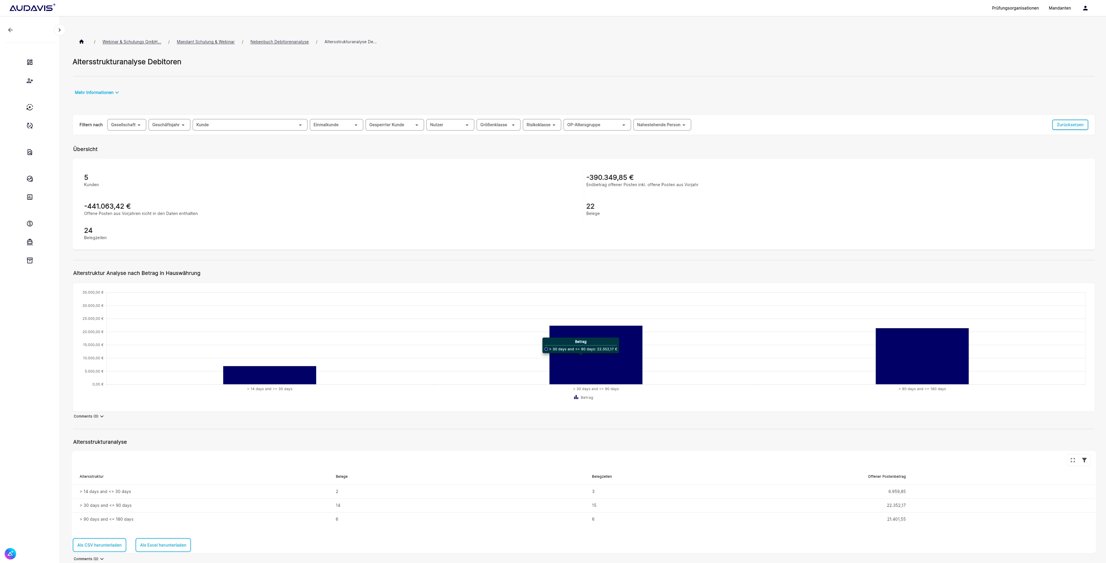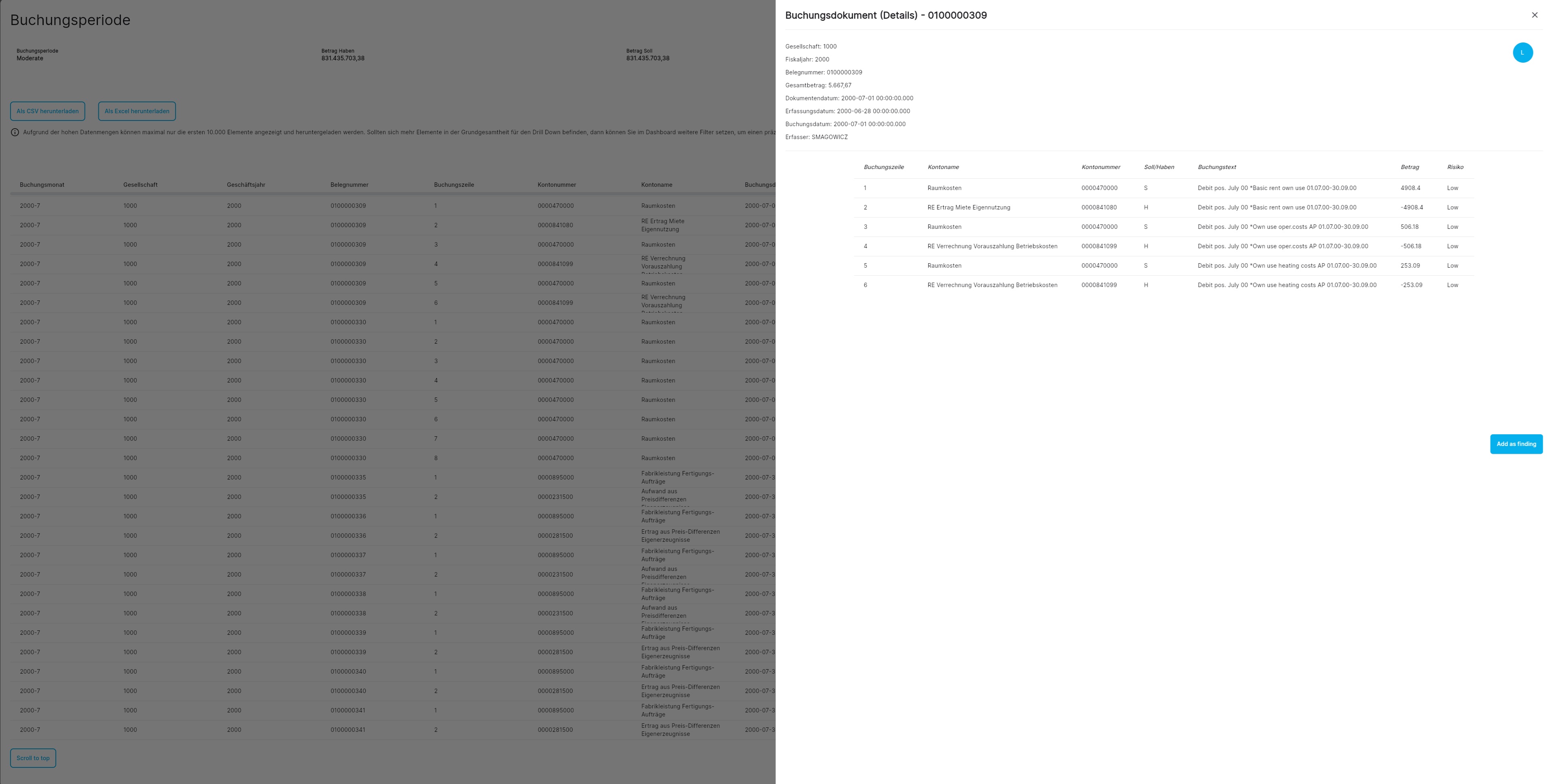 Die Arbeitspapiere und Dashboards, die AUDAVIS bereitstellt, können leicht konform mit den gängigen Prüfungsstandards dokumentiert und in einem beliebigen System für die Auftragsdokumentation hinterlegt werden. Jedes Arbeitspapier und jedes Dashboard kann in AUDAVIS final dokumentiert und danach inklusive der Dokumentierung und Kommentierung ganz einfach als Ganzes exportiert werden. Auch Drill Down Tabellen können jederzeit per Mausklick als Excel-Files für die weitere Bearbeitung oder Dokumentation aus AUDAVIS exportiert werden.