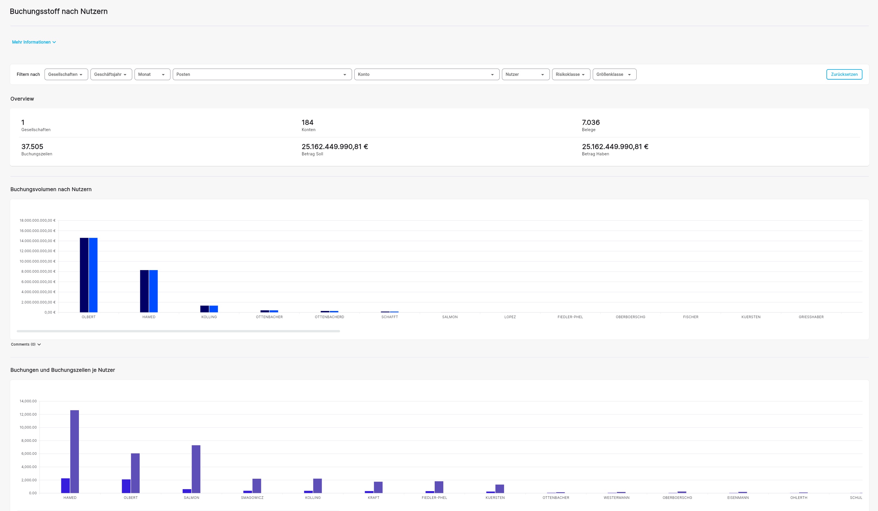 AUDAVIS verarbeitet den vollständigen Buchungsstoff in ein zentrales Datenmodell (Single-Source-of-Truth), aus dem sich eine Vielzahl an Prüfungsdashboards speisen, die an klassische Arbeitspapiere angelehnt sind (z. B. Abstimmungen HB-NB, Erwartungswertanalysen, Werthaltigkeitsprüfungen, JETs, KI-Risikobeurteilung, Drei-Wege-Abgleiche etc.). Die dynamischen Datenmodelle, lassen sich je nach Prüfungsschwerpunkt aggregieren und disaggregieren (z. B. nach Gesellschaften, Konten, Buchungstext, Nutzer, Datumsangaben, verschiedenen Datenanalyse- oder KI-Tests etc.).