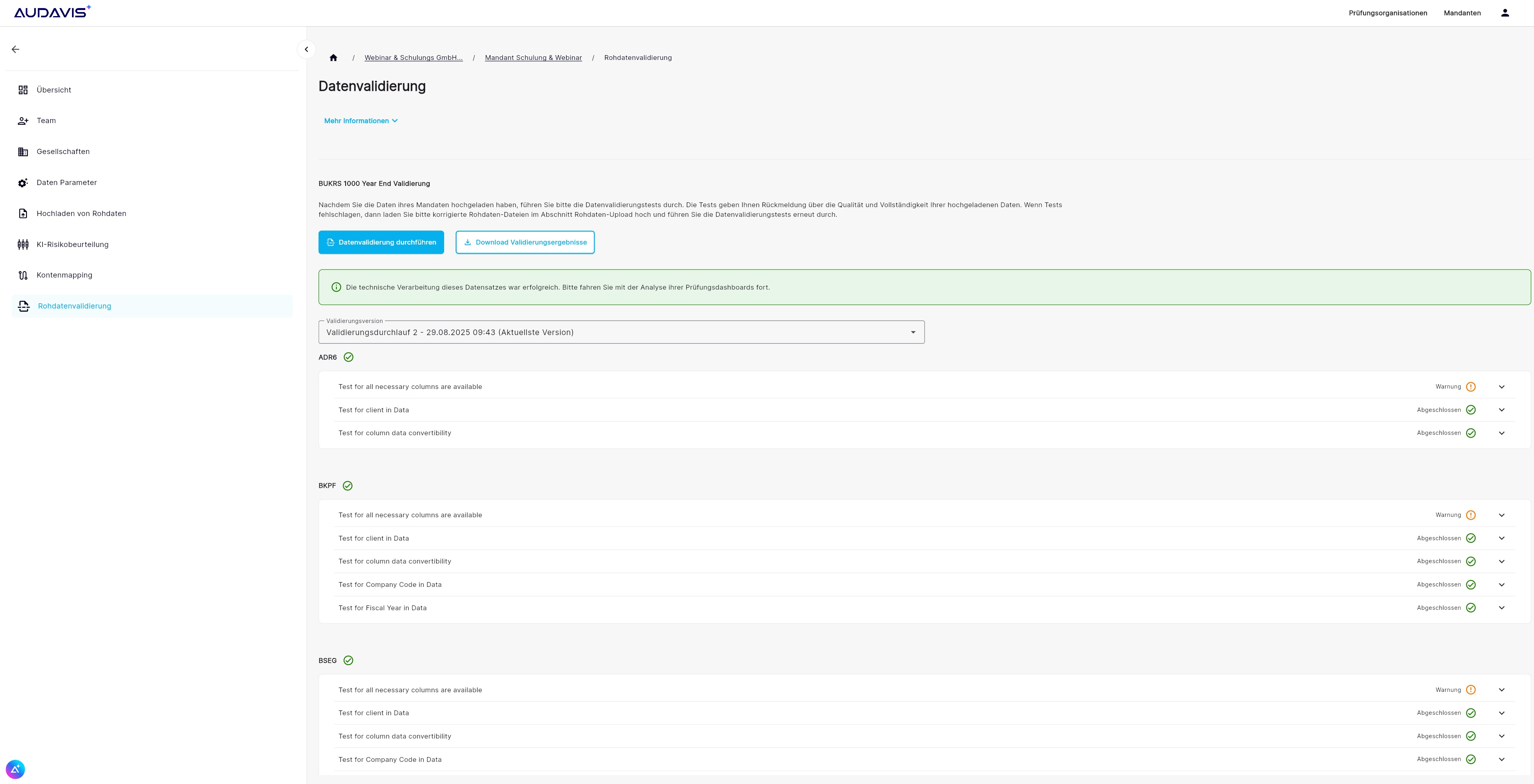 Im Ergebnis sind sämtliche Standardarbeitspapiere für die zentralen Prüfungsgebiete wie Hauptbuch, Debitoren, Kreditoren etc. vollautomatisiert bereitgestellt worden und der Prüfer muss lediglich noch die Würdigung der Ergebnisse vornehmen und kann sich dabei von den AUDAVIS KI-Modellen co-pilotieren lassen.